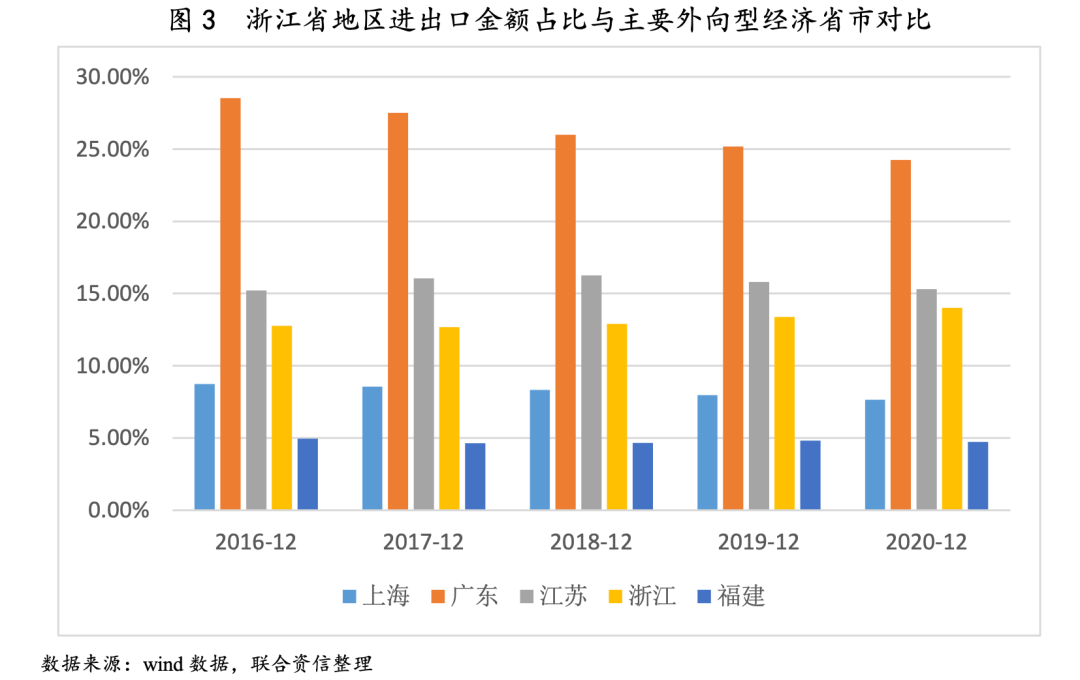 浙江省經(jīng)濟(jì)的高質(zhì)量發(fā)展,一方面與民營經(jīng)濟(jì)的活力緊密相連,另一方面與其自身的外向型經(jīng)濟(jì)發(fā)展密不可分。2017年4月,中國(浙江)自由貿(mào)易試驗(yàn)區(qū)掛牌成立,并于2020年在全國率先實(shí)現(xiàn)擴(kuò)區(qū),擴(kuò)區(qū)后涵蓋寧波片區(qū)、杭州片區(qū)和金義片區(qū),分別在國際航運(yùn)樞紐、人工智能、國際金融科技發(fā)展、跨境電商、數(shù)字經(jīng)濟(jì)以及小商品自由貿(mào)易中心、數(shù)字貿(mào)易創(chuàng)新等多個領(lǐng)域進(jìn)行發(fā)展。隨著各項(xiàng)政策的落地,或?qū)⑦M(jìn)一步促進(jìn)浙江省外向型經(jīng)濟(jì)的發(fā)展。從數(shù)據(jù)來看,浙江省進(jìn)出口金額占全國進(jìn)出口金額的比例維持在12%以上,并且呈逐年上升態(tài)勢,與江蘇的差距逐年拉進(jìn)。但另一方面,鑒于近年來中美關(guān)系的緊張以及全球疫情的擴(kuò)散對進(jìn)出口貿(mào)易的影響,未來浙江省外向型經(jīng)濟(jì)發(fā)展動力或?qū)⒚媾R一定挑戰(zhàn)。