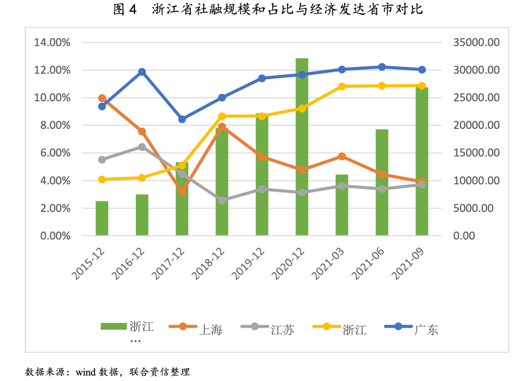 從金融業(yè)發(fā)展角度來看,浙江省較為突出的區(qū)位優(yōu)勢,以及領(lǐng)先的經(jīng)濟(jì)增速為地方金融行業(yè)發(fā)展奠定了良好的經(jīng)濟(jì)基礎(chǔ)。近年來,浙江省金融業(yè)整體發(fā)展平穩(wěn),對實(shí)體經(jīng)濟(jì)的支持力度不斷攀升,自2016年以來浙江省社融規(guī)模呈快速增長態(tài)勢,并且其社融占全國社融的比例明顯高于上海和浙江等經(jīng)濟(jì)發(fā)達(dá)省市。較好的社融增長體現(xiàn)了浙江地區(qū)金融體系對實(shí)體經(jīng)濟(jì)的強(qiáng)有力的支持能力。