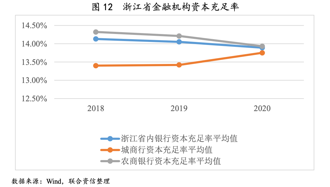 從浙江省內(nèi)城商行及農(nóng)商銀行資本充足率平均值差異情況看,近年來,浙江省內(nèi)農(nóng)商銀行資本充足率平均值略高于城商行資本充足率平均值水平,一方面系農(nóng)商銀行個體體量相較城商行而言體量相對較低,對具有一定規(guī)模或資金需求相對較高的客戶服務(wù)能力相對較弱,且農(nóng)商銀行主要集中于地方縣域,客戶類型中涉及風(fēng)險權(quán)重相對較小的小微企業(yè)及個體工商戶等占客戶總量比重相對較高,帶來的資本消耗相對較低。但是,近年來,浙江省內(nèi)城商行資本充足率平均值呈上升趨勢,一方面系城商行近年來業(yè)務(wù)拓展相較于省內(nèi)農(nóng)商銀行而言在資本消耗力度方面相對較高,對資本補(bǔ)充需求高于省內(nèi)農(nóng)商銀行,且浙江省內(nèi)城商行多由地方政府參股,相較于普遍由民營股東組成且股權(quán)結(jié)構(gòu)散的省內(nèi)農(nóng)商銀行而言,省內(nèi)城商銀行股東增資意愿相對較高,相對較易獲得來自股東的資本補(bǔ)充。