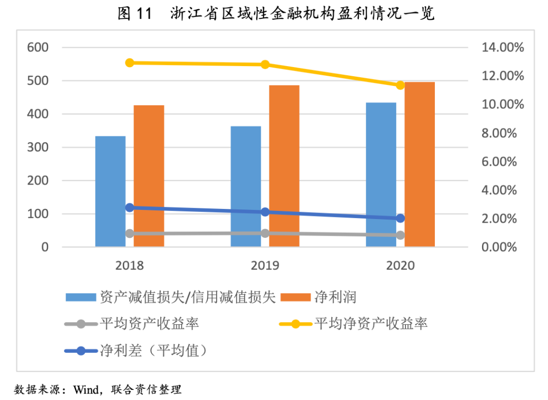 浙江省內(nèi)區(qū)域性銀行收入結(jié)構(gòu)相對較好,盈利能力相對較強(qiáng);但凈利差有所收窄,且較高的減值準(zhǔn)備計提不利于盈利能力體現(xiàn)。從選取樣本中反映的收入結(jié)構(gòu)看,近年來,浙江省內(nèi)區(qū)域性銀行利息凈收入、手續(xù)費(fèi)與傭金凈收入和投資收益之和呈逐年上升的態(tài)勢。其中,利息凈收入仍為浙江省內(nèi)區(qū)域性銀行的主要收入來源,且占三類收入渠道之和的比重呈小幅提升的態(tài)勢,2018、2019和2020年利息凈收入分別占當(dāng)年?duì)I業(yè)收入的68.67%、67.68%和71.89%;投資收益增速及占三類收入渠道之和的比重有所下降,但投資收益占三類收入渠道之和的比重相對適中,2018、2019和2020年投資收益分別占當(dāng)年?duì)I業(yè)收入的23.06%、22.35%和22.51%;手續(xù)費(fèi)及傭金凈收入占三類收入渠道之和的比重持續(xù)保持在相對較低水平。從收入結(jié)構(gòu)可以得出,浙江省內(nèi)區(qū)域性銀行在保證信貸資產(chǎn)投放能夠帶來良好收益的同時,對于富余資金的營運(yùn)能力相對較強(qiáng),整體收入結(jié)構(gòu)相對良好。近年來,在國家倡導(dǎo)金融機(jī)構(gòu)服務(wù)實(shí)體經(jīng)濟(jì),讓利于實(shí)體經(jīng)濟(jì)、小微企業(yè)等政策的持續(xù)推進(jìn),以及浙江省地方法人金融機(jī)構(gòu)已于2020年內(nèi)完成存量浮動利率貸款定價基準(zhǔn)的轉(zhuǎn)換的影響下,浙江省內(nèi)區(qū)域性金融機(jī)構(gòu)貸款定價水平持續(xù)下降,疊加同業(yè)攬存競爭力持續(xù)上升帶來的負(fù)債成本增長,共同導(dǎo)致近年來利差水平持續(xù)縮窄,2018、2019和2020年凈利差平均值分別為2.77%、2.46%和2.02%。此外,浙江省區(qū)域性金融機(jī)構(gòu)持續(xù)加大資產(chǎn)減值損失的計提力度(見圖10),對利潤實(shí)現(xiàn)形成一定影響,近年來凈利潤增速明顯下降,相關(guān)收益率指標(biāo)有所下降,但相較于其他地區(qū)同業(yè)機(jī)構(gòu)來看,仍處在相對較好水平。