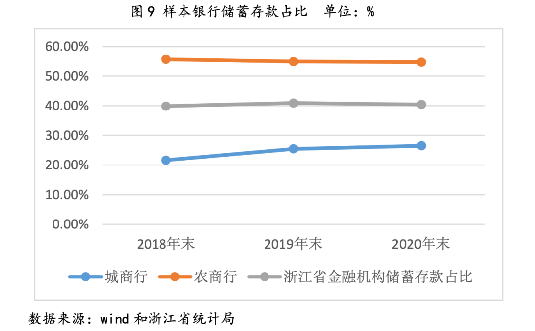 從存款結(jié)構(gòu)來看,公司存款的拉動作用較為突出。截至2020年末,浙江省金融機(jī)構(gòu)本外幣存款余額15.23萬億元,較上年末增長15.94%,增速較上年略有提升。其中,住戶存款占比40.44%,增速較去年有所下滑。從樣本數(shù)據(jù)來看,不同類型銀行的存款來源具有一定差異性,城商行對儲蓄存款的依賴性相對較低,農(nóng)商行相對更多的依賴儲蓄存款。主要是因?yàn)檗r(nóng)商行在較為下沉的網(wǎng)點(diǎn)覆蓋面上而言具有一定的個人客戶營銷優(yōu)勢,而城商行在資本實(shí)力以及與政府合作方面具備較強(qiáng)競爭力,因此公司存款為此類銀行的主要來源。整體而言,得益于浙江省區(qū)域經(jīng)濟(jì)保持較強(qiáng)活力,銀行業(yè)在存款發(fā)展上面臨的壓力相對較小;同時整體儲蓄存款維持在40%以上,存款穩(wěn)定性較好,并且中小型農(nóng)商銀行擁有更高的個人存款占比,存款穩(wěn)定性更強(qiáng)。但同時儲蓄存款一般具有更高的存款成本,也在一定程度上推高了中小農(nóng)商銀行的負(fù)債成本。