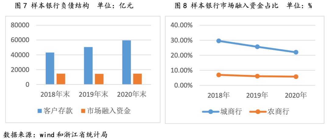 2.客戶存款依舊是銀行的主要負(fù)債來源,對于市場融入資金的依賴度逐漸下降,高成本儲蓄負(fù)債對于農(nóng)商行成本管控帶來負(fù)面影響。
