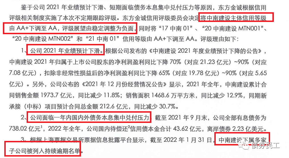 此前的2022年2月24日,東方金誠披露了《關(guān)于下調(diào)江蘇中南建設(shè)集團(tuán)股份有限公司主體及相關(guān)債項信用等級的公告》,將中南建設(shè)的主體信用等級由AA+下調(diào)至AA,并將評級展望調(diào)整為負(fù)面。本次評級下調(diào)的主要原因是公司2021年業(yè)績預(yù)計下滑、面臨集中兌付壓力、子公司被列入票交所逾期名單等。