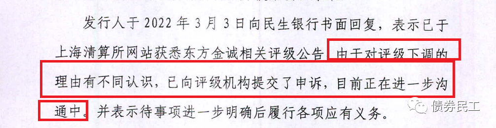 2022年3月7日,江蘇中南建設(shè)集團(tuán)股份有限公司(以下簡稱“中南建設(shè)”)披露《中國民生銀行股份有限公司關(guān)于東方金誠國際信用評估有限公司下調(diào)江蘇中南建設(shè)集團(tuán)股份有限公司主體及相關(guān)債項信用等級觸發(fā)投保條款事項的公告》,明確提出“對于評級下調(diào)的理由有不同認(rèn)識,已向評級機構(gòu)提交了申訴”。也就是說,發(fā)行人對評級結(jié)果提出了異議。