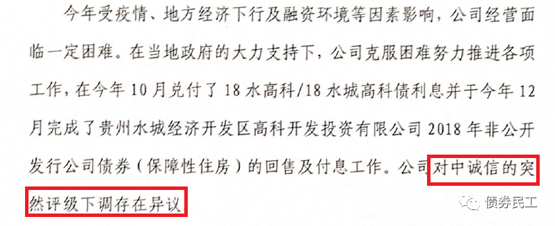 貴州水城經(jīng)投在2020年12月18日發(fā)布公告,明確指出“對突然評級下調(diào)存在異議”。從后期的信息披露情況來看,貴州水城經(jīng)投應(yīng)該是沒有向評級公司提出了正式的復(fù)議申請,因為如果發(fā)行人正式提出了異議申請,評級機構(gòu)需要出具明確的復(fù)議結(jié)果并公告。