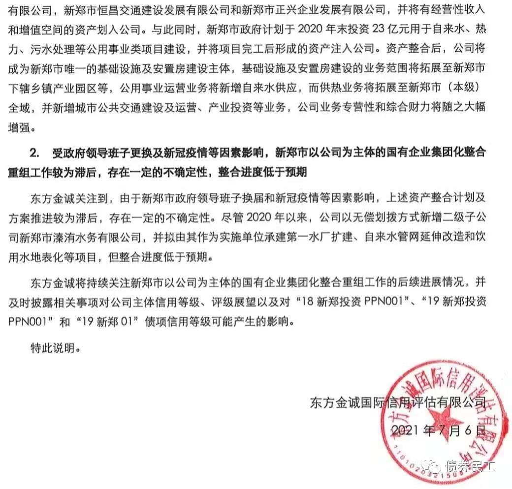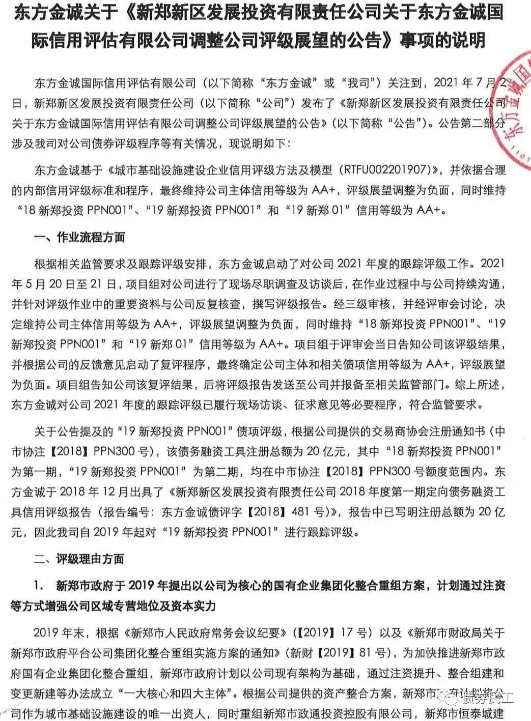 2021年6月29日,東方金誠的跟蹤評級報告評定新鄭新區(qū)發(fā)展投資有限責(zé)任公司(以下簡稱“新鄭投資”)發(fā)行的“18新鄭投資PPN001”和“19新鄭投資PPN001”的主體評級為AA+,評級展望由穩(wěn)定調(diào)整為負(fù)面。新鄭投資在2021年7月2日發(fā)布了《關(guān)于東方金誠國際信用評估有限公司調(diào)整公司評級展望的公告》,明確申明了兩個特別說明:一是新鄭投資認(rèn)為 “19新鄭投資PPN001”未做債項評級安排;二是新鄭投資認(rèn)為東方金誠跟蹤評級未進(jìn)行現(xiàn)場盡調(diào)訪談、也未征求公司意見,評級報告出具未履行必要流程,正在申請復(fù)議中。