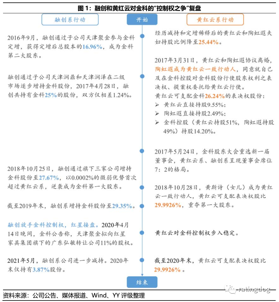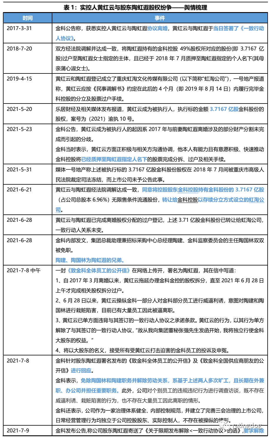 隨著2020年4月起融創(chuàng)放手,將所持11%金科股權(quán)轉(zhuǎn)讓給紅星家具集團(tuán)并進(jìn)一步減持,市場(chǎng)認(rèn)為黃紅云對(duì)金科控制權(quán)步入穩(wěn)定。但不料一年之后,黃紅云的家庭紛爭(zhēng)讓其控制權(quán)增添變數(shù),引發(fā)監(jiān)管發(fā)函詢(xún)問(wèn),上市公司的治理層面籠罩一層陰云。