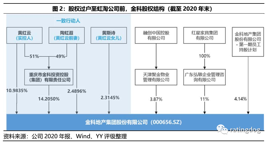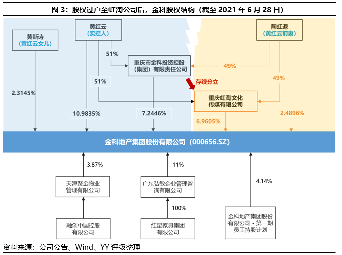 股權(quán)過(guò)戶(hù)后,虹淘文化持有金科6.9605%股比,金科控股對(duì)金科的股比由14.205%降為7.2446%,其他股東持股比例不變。黃紅云在金科控股和虹淘文化股權(quán)結(jié)構(gòu)中占比51%,陶虹遐占比49%。