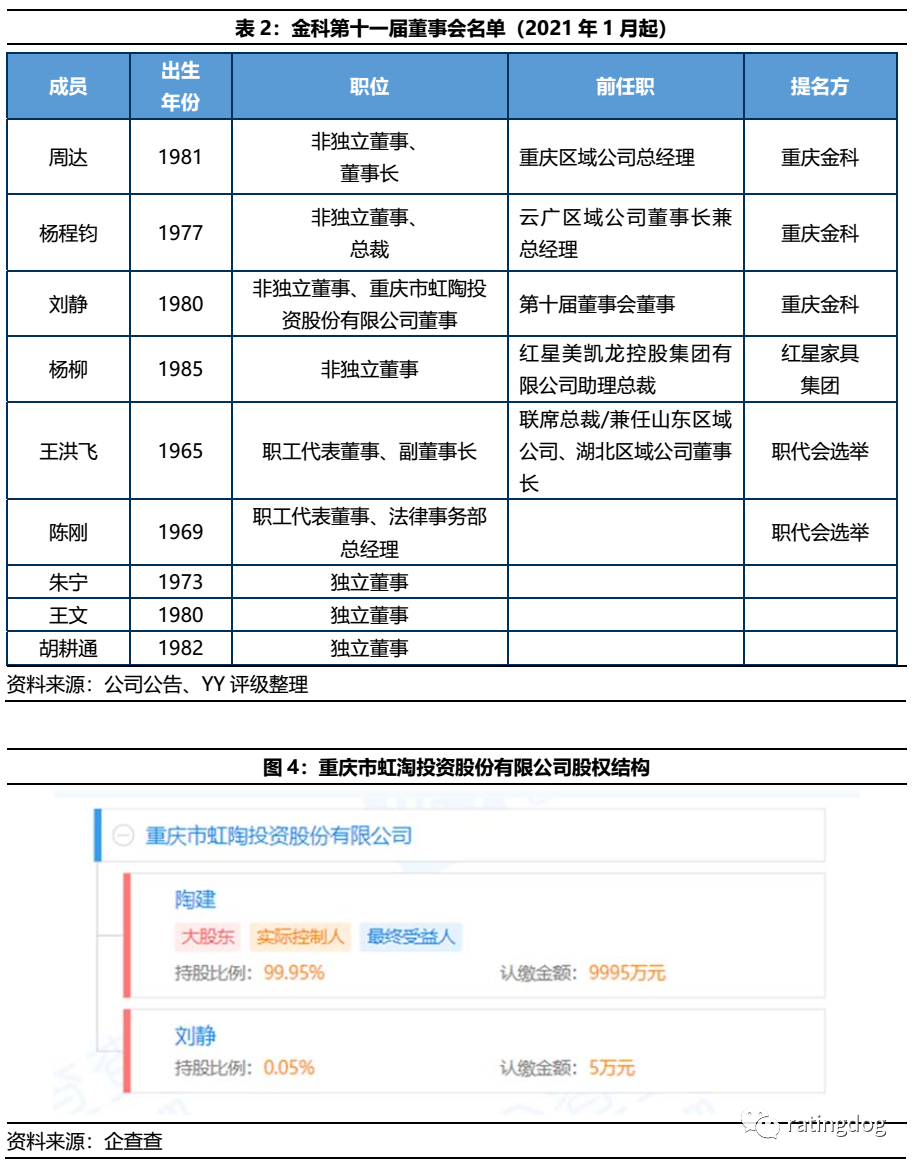 劉靜除了擔(dān)任金科董事以外,還任重慶市虹陶投資股份有限公司的董事,企查查顯示該公司大股東為陶建。因此,推測(cè)劉靜偏向于陶虹遐派系。