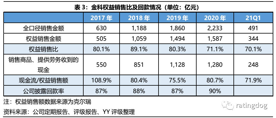 在合作開(kāi)發(fā)成為行業(yè)趨勢(shì)的背景下,公司權(quán)益銷(xiāo)售比下滑到70%左右,仍保持較高水平。在公司推行的一年現(xiàn)金流回正的“高周轉(zhuǎn)”策略下,2020年回款率達(dá)到90%。21年一季度未披露銷(xiāo)售回款,但是對(duì)比銷(xiāo)售商品、提供勞務(wù)收到的現(xiàn)金和公司的權(quán)益銷(xiāo)售額,占比約71.9%,雖然低于2020年水平,但縱向來(lái)看波動(dòng)不大。