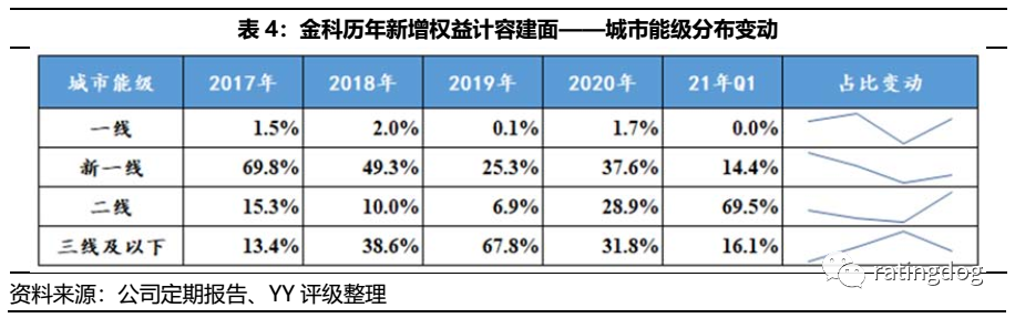 邊際來(lái)看,2020年至今,公司有意提升拿地城市能級(jí);新增土地儲(chǔ)備按權(quán)益計(jì)容建筑面積計(jì)算,2020年二線(xiàn)(含新一線(xiàn))城市占比約66%,21年Q1比例提升至84%。