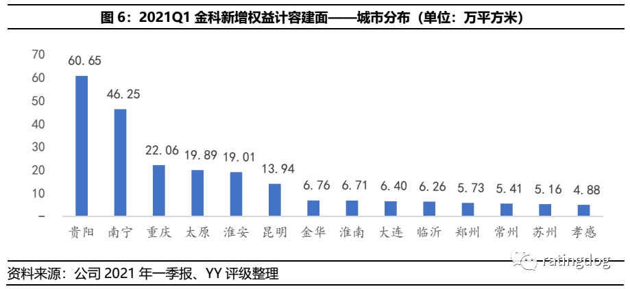 區(qū)位布局上,公司2021Q1在重慶新增22萬(wàn)平方米權(quán)益計(jì)容建面,在4月份的首批集中供地土地拍賣(mài)中也有所斬獲,在房企競(jìng)爭(zhēng)中排名第6。其他主要的投拓項(xiàng)目位于貴陽(yáng)經(jīng)開(kāi)區(qū)(離城區(qū)較遠(yuǎn))、南寧市的青秀區(qū)和綜合保稅區(qū)、太原市清徐縣和淮安市清江浦區(qū)等。僅從2021Q1新獲土儲(chǔ)來(lái)看,公司保持了大本營(yíng)重慶的優(yōu)勢(shì),但在其他城市的土儲(chǔ)質(zhì)量則存在分化,不應(yīng)僅以城市能級(jí)作為評(píng)判標(biāo)準(zhǔn)。