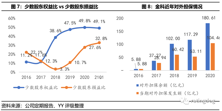 公司近兩年的少數(shù)股東權(quán)益占比已接近一半,規(guī)模較大,而且2020年少數(shù)股東損益比約27.6%,跨期對(duì)比不匹配,潛在為非股比分配特征,“明股實(shí)債”嫌疑較大。而且公司存在造表痕跡,僅2020年,金科就將8家子公司移出表內(nèi),理由為“少數(shù)股東增資或根據(jù)相關(guān)補(bǔ)充約定而導(dǎo)致公司喪失控制權(quán)”,這8家子公司全部虧損。近年公司及其子公司對(duì)外擔(dān)保余額攀升明顯,截至2020年末達(dá)181億元,如同之前深度報(bào)告所述,表外債務(wù)風(fēng)險(xiǎn)值得關(guān)注,而且并未緩解。
