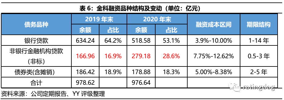 債務(wù)總額受控,公司表內(nèi)融資結(jié)構(gòu)惡化。2020年成本較高的非標(biāo)貸款占比增長(zhǎng)至28.6%,金額大幅增加112億元,與此同時(shí)銀行貸款減少116億元。