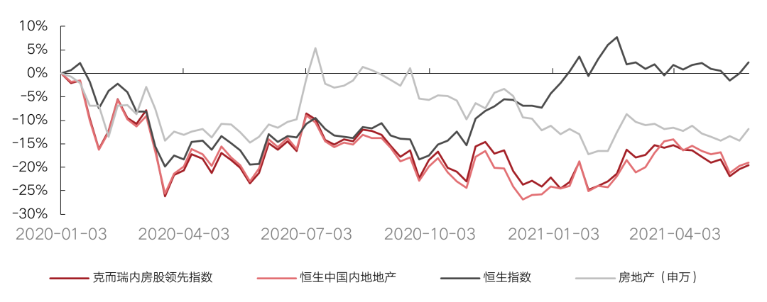 整體來看,自2020年1月1日至今,克而瑞內(nèi)房股領(lǐng)先指數(shù)跌幅19.5%,同期恒生中國內(nèi)地地產(chǎn)指數(shù)跌幅19.0%。恒生指數(shù)漲幅2.4%,房地產(chǎn)(申萬)板塊跌幅11.8%。2021年5月,恒生指數(shù)上升1.5%,克而瑞內(nèi)房股領(lǐng)先指數(shù)下降0.9%,恒生中國內(nèi)地地產(chǎn)指數(shù)下降2.2%,房地產(chǎn)(申萬)板塊上升1.8%。