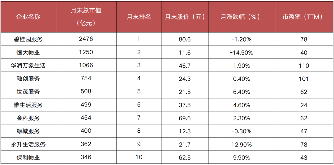 表:5月末物業(yè)股市值排行TOP10及漲幅情況