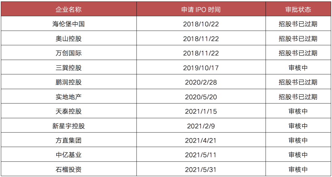 截至2021年5月31日,在港交所遞交招股書但仍未上市的房企共有11家,其中2021年以來共有5家房企房企遞交招股書。值得注意的是,2021年之前遞交上市申請的企業(yè)中僅有三巽控股更新過招股書,其余企業(yè)均顯示“招股書已過期”。