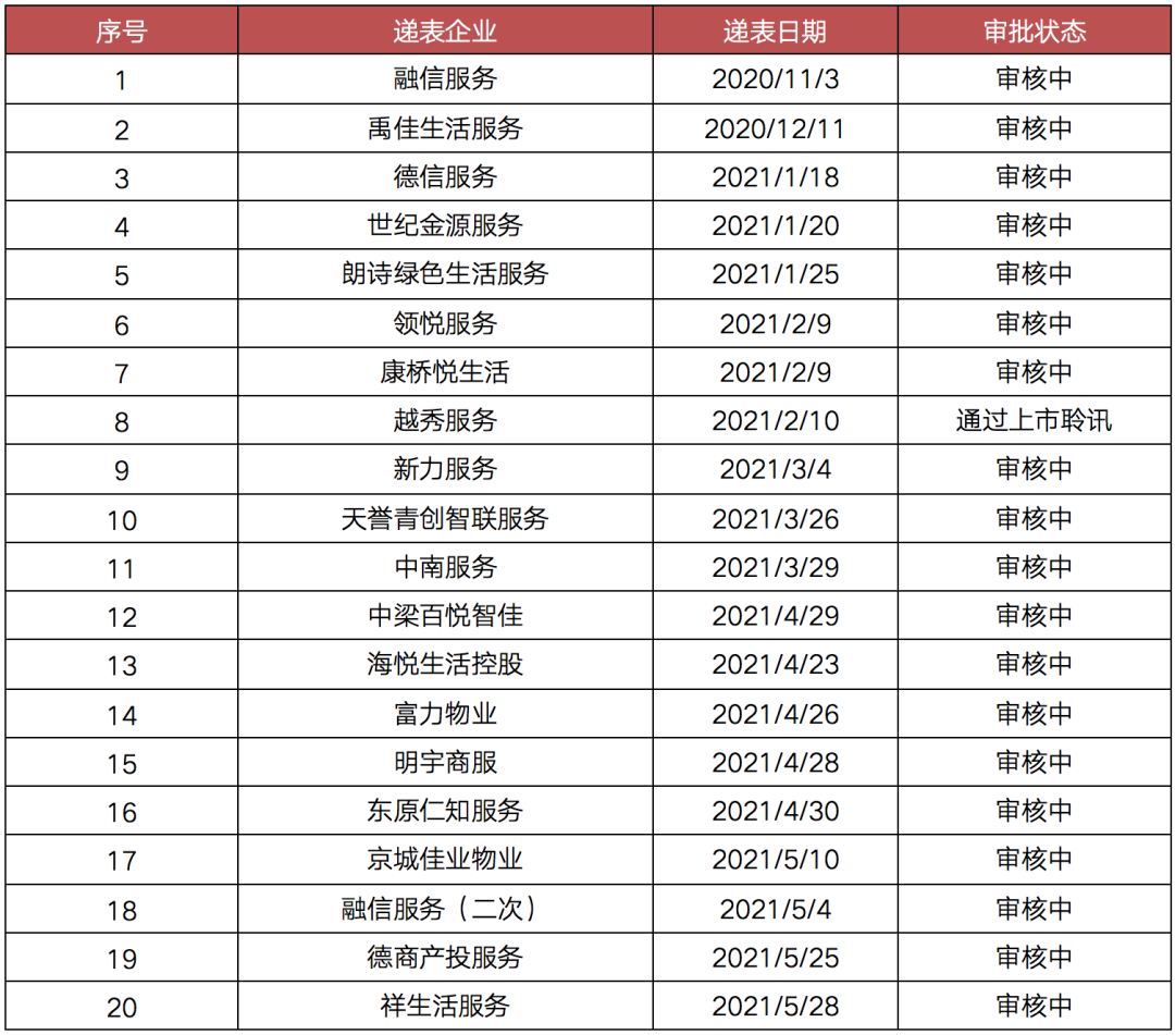 在分拆物業(yè)公司上市方面似乎更為順利,5月多家房企分拆旗下物業(yè)公司赴港上市,包括北京城建、德商以及祥生,并且有新希望服務(wù)1家物企在5月完成上市。截至5月31日,在港交所遞交招股書仍未上市的物業(yè)企業(yè)共有20家,其中越秀服務(wù)已通過上市聆訊,融信服務(wù)則兩次遞表。