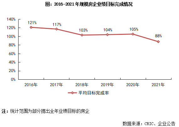 2021年,規模房企整體的目標完成情況遠不及歷史同期,規模房企平均目標完成率不到90%,明顯低于近年105%以上的平均水平。在披露年度業績目標的部分規模房企中,截至12月末有逾8成房企未完成全年業績目標。但綠城、華潤、金地、濱江等房企仍超額完成全年目標。可見,即使年內規模房企已對業績增長保持了謹慎預期,并適度調降了銷售目標的情況下,但下半年市場大幅降溫、企業業績持續萎縮的影響下,多數企業的業績壓力仍然較大。