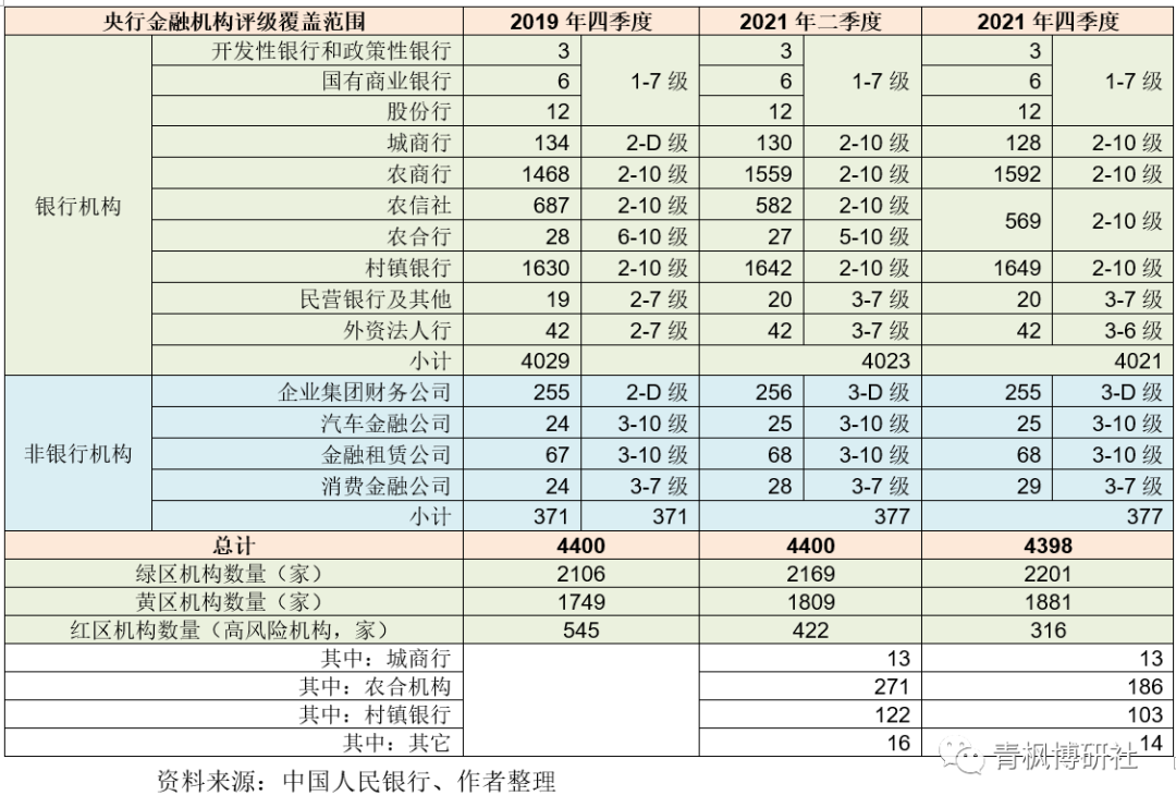 央行金融機(jī)構(gòu)評級結(jié)果分為11級,即1-10級和D級,級別越高表示機(jī)構(gòu)的風(fēng)險越大。其中,評級結(jié)果1-5級為“綠區(qū)”、評級結(jié)構(gòu)6-7級為“黃區(qū)”、評級結(jié)果8-D級為“紅區(qū)”。“綠區(qū)”和“黃區(qū)”機(jī)構(gòu)可視為在安全邊界內(nèi)。