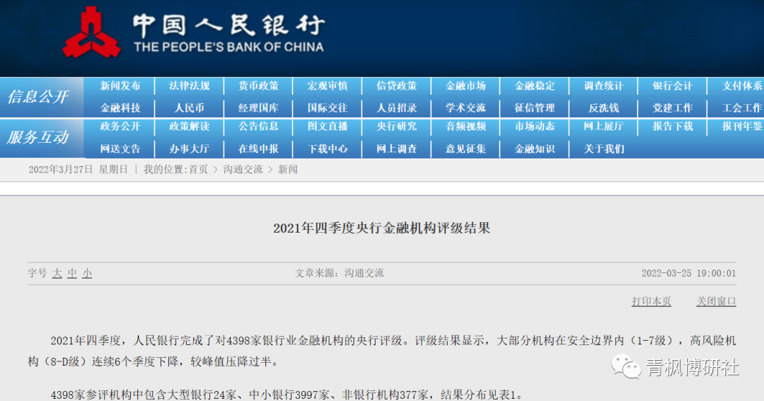 (一)2022年3月25日,央行公布2021年四季度央行金融機(jī)構(gòu)評級結(jié)果。結(jié)果顯示,截至2021年底,我國高風(fēng)險機(jī)構(gòu)數(shù)量已降至316家,較649家(2019年三季度)的峰值減少333家,而這已經(jīng)是連續(xù)6個季度下降。