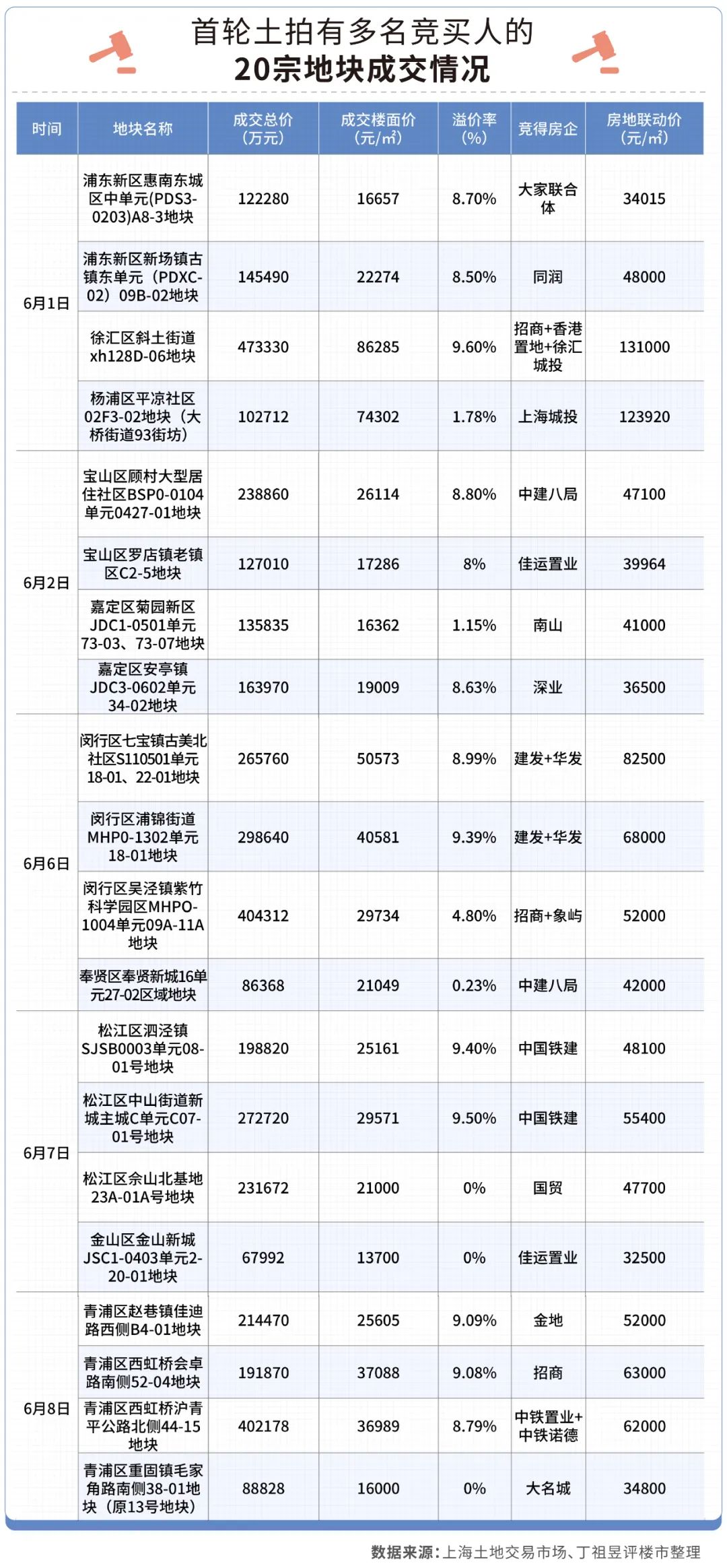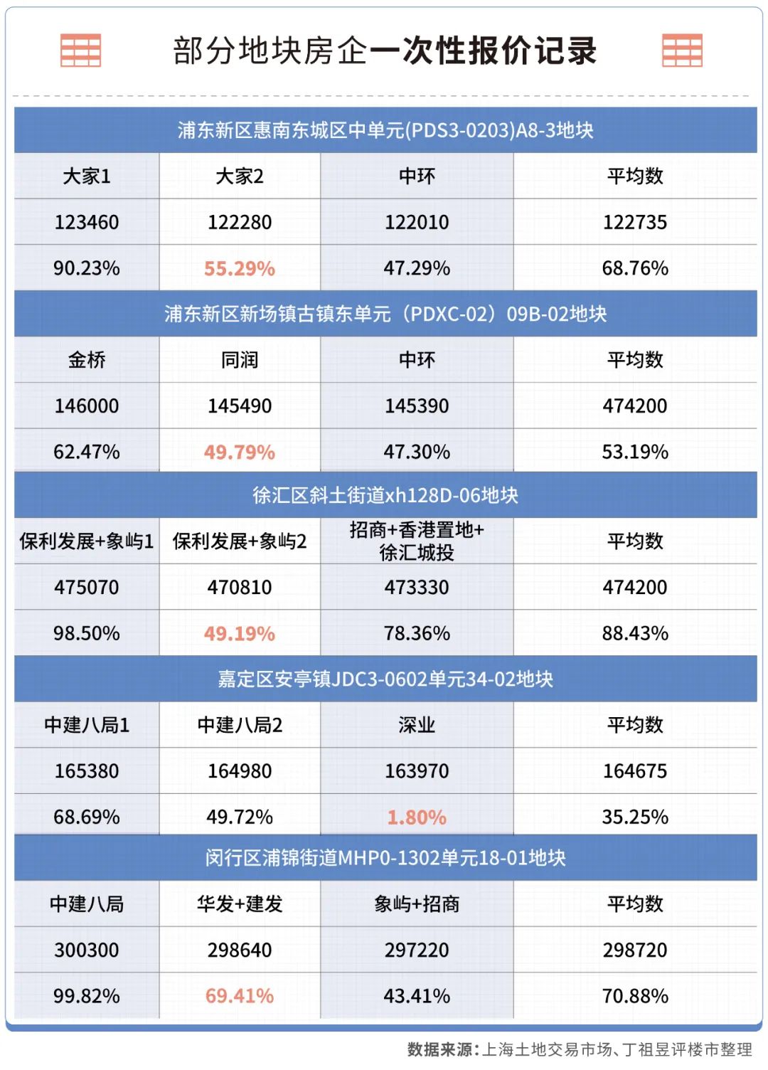 所有成交地塊中,溢價率最高為9.6%,該地塊為招商聯合體拿下的徐匯區斜土街道xh128D-06地塊,成交總價47.3億元,樓面價8.6萬元/平方米。作為開拍首日的“重頭戲”,吸引兩大聯合體共5家房企競買,觸及中止價后,進入一次性報價階段。
