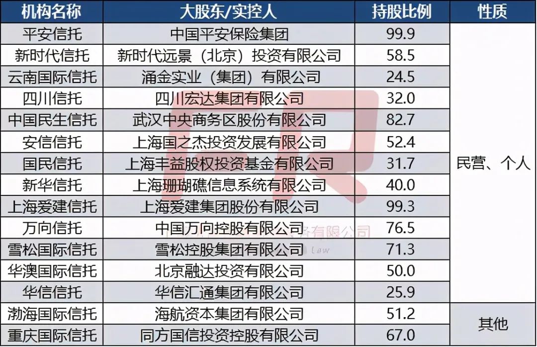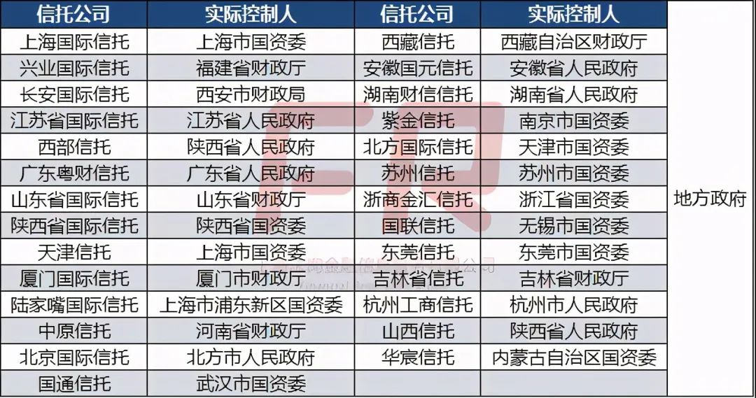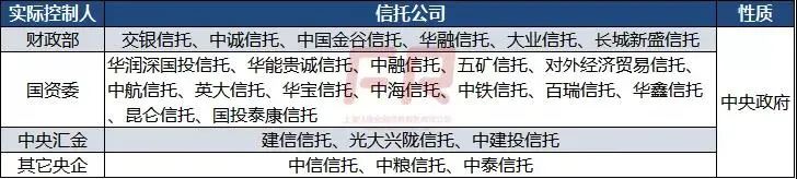 本身信托行公司只有68家,而在這68家信托公司當(dāng)中,絕大部分為國有信托公司。區(qū)別在于實際控制人是中央層面的,比如財政部、國資委、中央?yún)R金或者其他產(chǎn)業(yè)的央企;還是地方政府有關(guān)部門(基本也是財政廳或者國資委)。