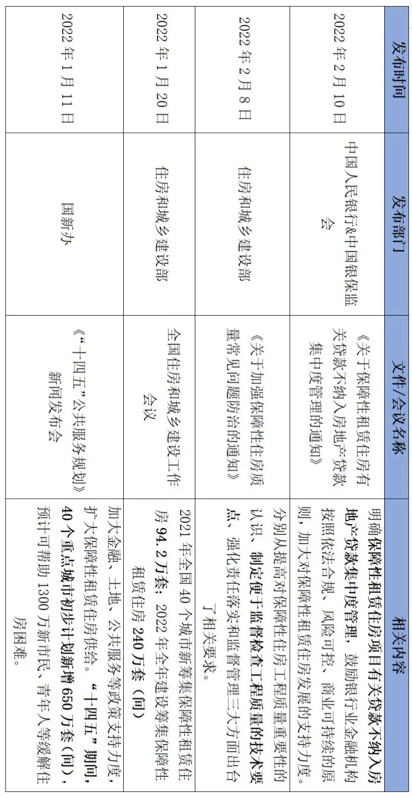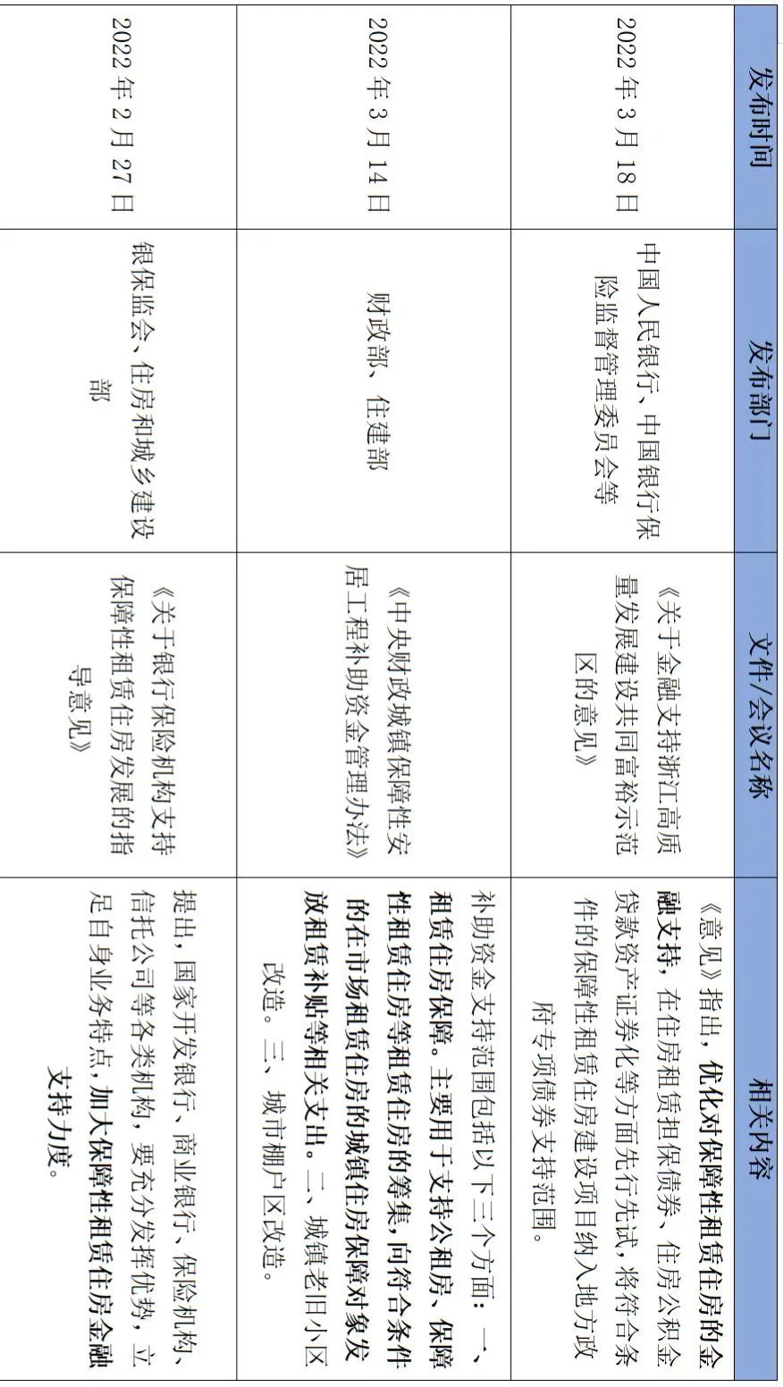 2022年第一季度,中央及各地方政府相繼發布發展保障性租賃住房的實施意見,明確保租房供應目標,加強金融支持,完善金融服務體系,強調工程質量重要性,加速推進保障性租賃住房的建設。