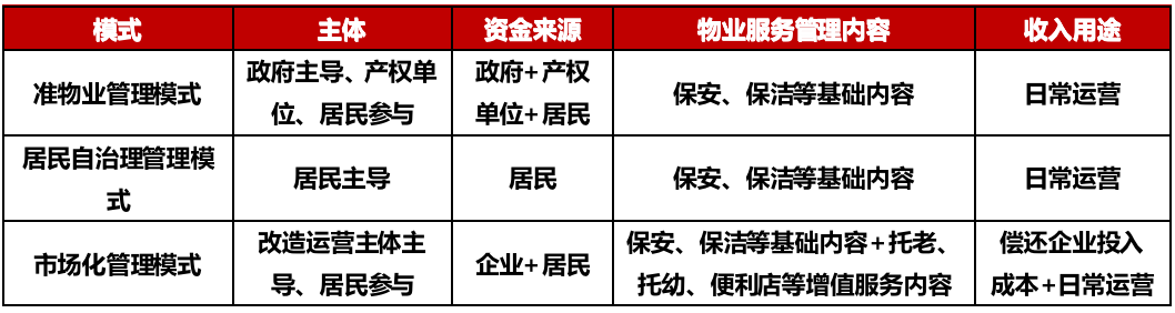 市場化管理模式。這種模式是通過社會資本的投資,對老舊小區的基礎設施、公共服務設施等進行改造,改善居民基礎生活環境、提高居民生活便利度,如,改造停車場、增加養老、醫療、家政、快遞、便利店等。這種模式在覆蓋基礎物業服務內容基礎上,會同時覆蓋多種增值服務內容。相應的,小區后續的物業管理、政府補貼、服務收費、商業收費等收益,也歸為其所有。