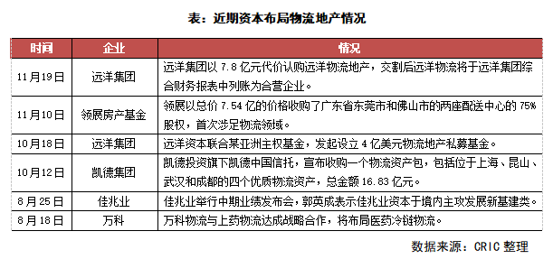 2021年11月19日遠(yuǎn)洋集團(tuán)以7.8億元代價認(rèn)購遠(yuǎn)洋物流地產(chǎn)所配發(fā)的3萬股目標(biāo)股份,交割后遠(yuǎn)洋物流將于遠(yuǎn)洋集團(tuán)綜合財務(wù)報表中列賬為合營企業(yè)。而不久前,10月凱德中國信托先以16.834億的價格收購了上海、昆山、武漢和成都的四個優(yōu)質(zhì)物流資產(chǎn)。后11月,領(lǐng)展又以7.54億的價格收購了位于廣東省東莞市和佛山市的兩座配送中心的75%股權(quán),實(shí)現(xiàn)了首次涉足物流領(lǐng)域。