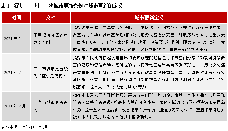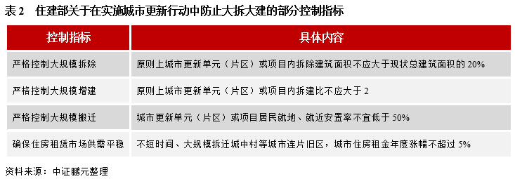8月30日,住建部發布的《關于在實施城市更新行動中防止大拆大建問題的通知》就通過拆除比例、拆建比例、以及就地就近安置率等三大指標嚴格控制大規模拆遷和增建。因此,我們認為未來的城市更新是“留改拆”并舉的舊城改造,可以包含部分拆遷安置內容,但是其更注重空間上的統籌規劃、發展上的可持續、經濟業態上的布局等理念。所以,過去一段時間純粹的拆遷安置類棚改項目不屬于現階段城市更新范疇。