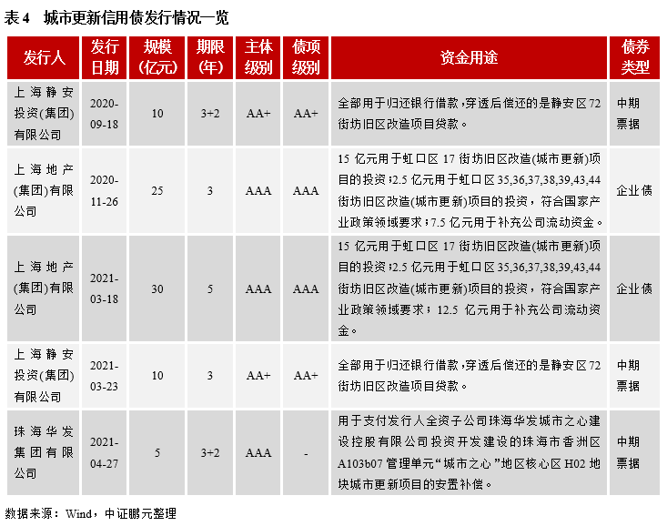 據不完全統計,截至2021年8月底,信用債市場共發行5只城市更新債券,募集資金總額80億元,由3家發行人發行,即上海靜安投資(集團)有限公司、上海地產(集團)有限公司、珠海華發集團有限公司。債券類型上,有2只企業債、3只中期票據,具體見表4。
