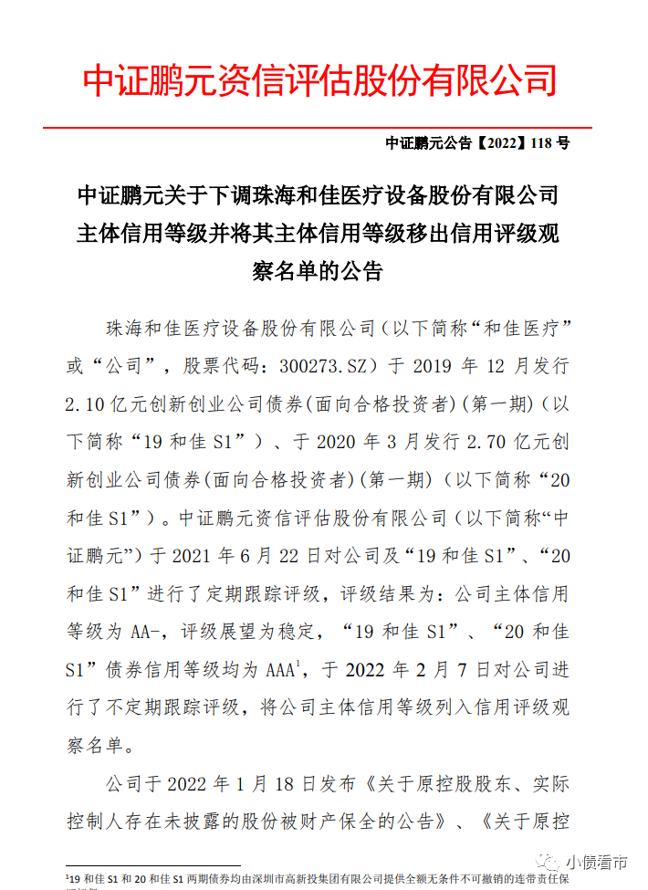 3月24日,中證鵬元公告稱,將和佳醫療(300273.SZ)主體信用等級由“AA-”下調至“A”,評級展望由“穩定”調整為“負面”,同時將其主體信用等級移出信用評級觀察名單,維持“19和佳S1”、“20和佳S1”債券信用等級均為AAA。