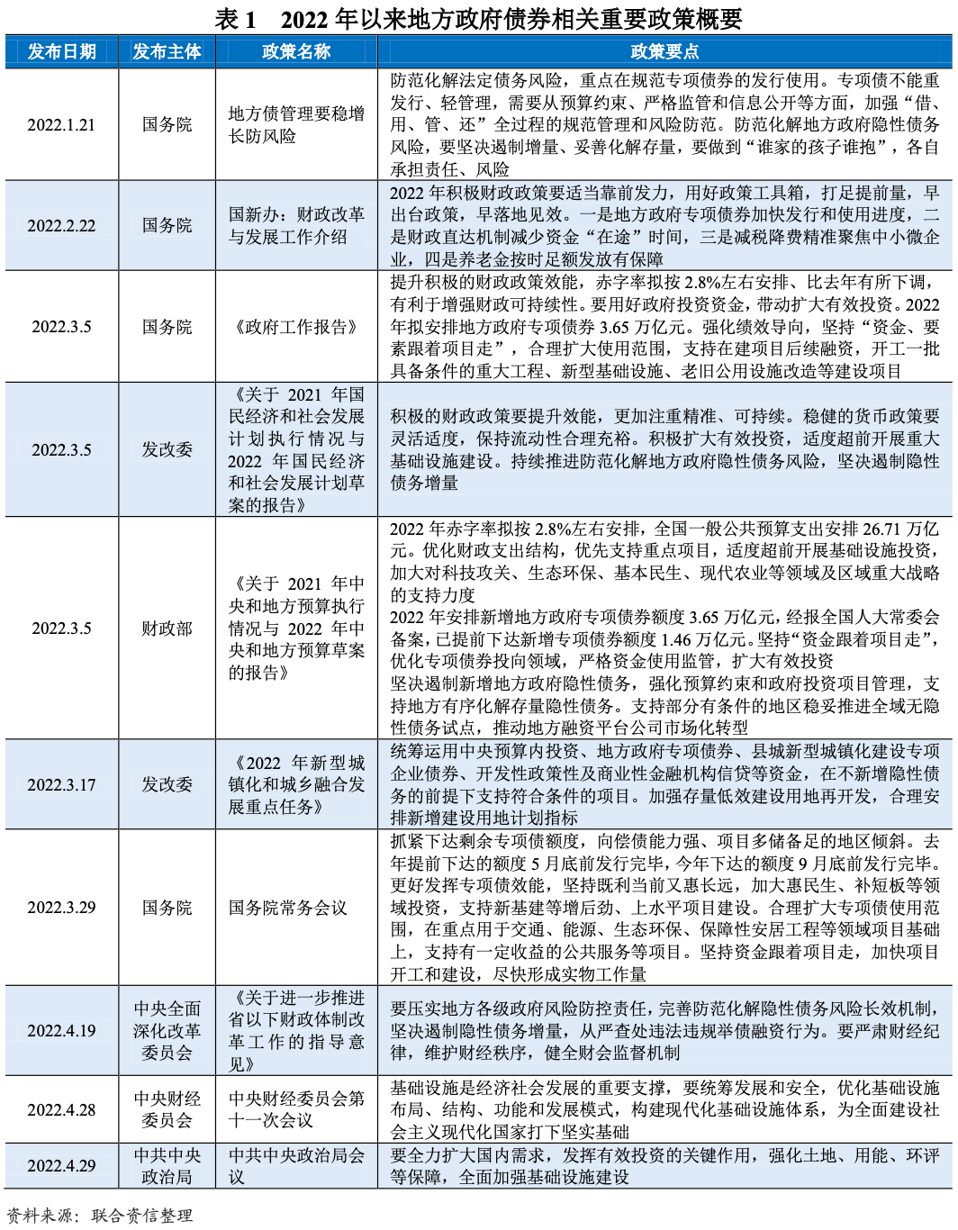 2022年一季度,地方政府債券發行規模合計1.82萬億元,同比增長103.84%。在穩增長重要性提高以及堅決遏制新增地方政府隱性債務的政策背景下,2022年以來地方政府債券相關政策主要體現在發行前置、提升專項債效能和防范風險等方面。從市場層面看,地方政府債券發行表現出期限拉長、發行節奏前置、發行利率顯著下降、期限及區域利差收斂的特征。預計今年作為“前門”的地方政府債有望持續發力,二季度或為發行高峰,地方政府隱性債務嚴監管政策仍將持續,專項債資金監管將繼續強化、強調資金使用效率,地方政府債券發行定價將更加市場化。