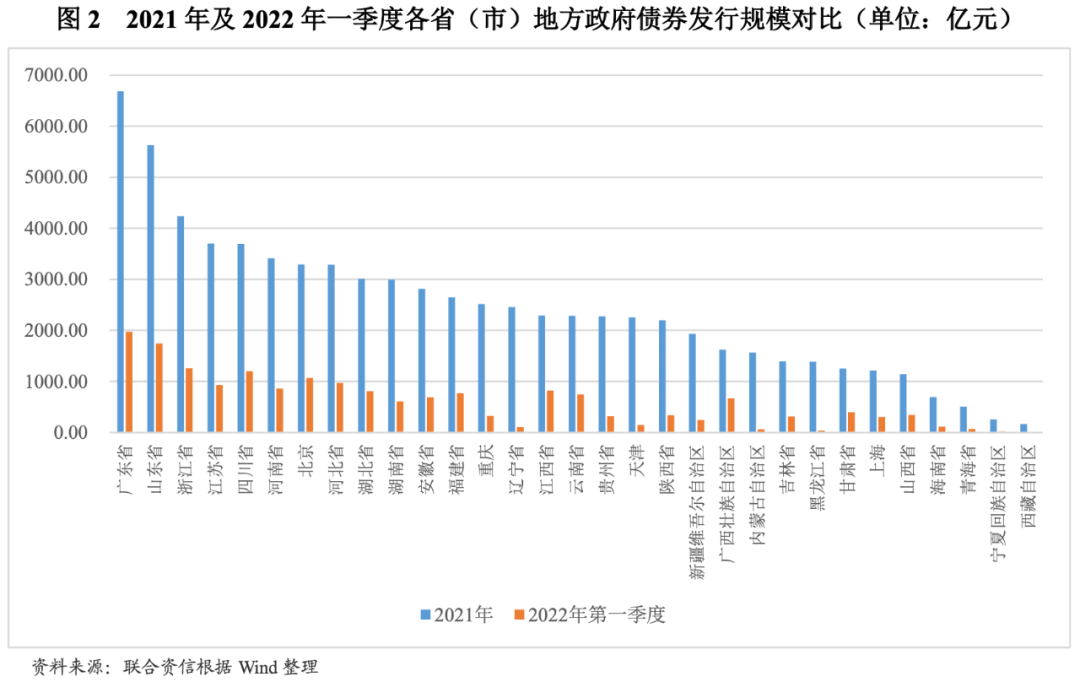 各省市發行規模仍保持明顯分化。從發行區域的分布情況看,2022年第一季度,除西藏自治區外,全國各省級行政區和5個計劃單列市均有地方政府債券發行,但各省市發行規模分化較為明顯。整體看,發行規模前三名的地區為廣東省、山東省和浙江省,其2022年一季度的發行規模分別相當于2021年全年的29.50%、30.95%和29.72%,均超過全國24.38%的平均水平。從凈融資額來看,廣東省和山東省凈融資額超1500億元,浙江省和四川省凈融資額超千億,河北省、江蘇省和湖北省等11個省份凈融資額超500億。
