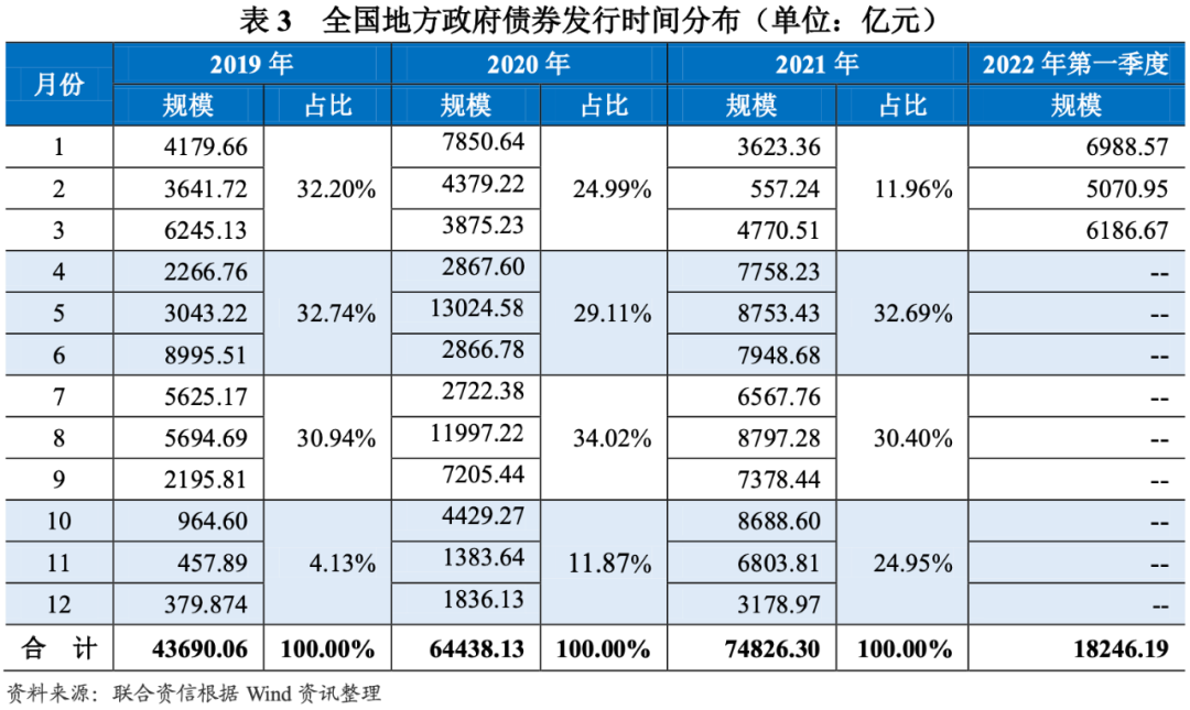 2022年發行節奏整體前置,二季度或為發行高峰。以往年度,地方債發行高峰通常集中在6-8月,2022年發行節奏則明顯前置。2021年底召開的中共中央政治局會議強調,2022年經濟工作要穩字當頭,保證財政支出強度,加快支出進度,適度超前開展基礎設施投資;年初以來,各地疫情擴散帶來的經濟下行壓力及財政缺口,也進一步凸顯了地方政府債在穩增長、調周期方面的重要度。3月29日,國務院常務會議部署專項債,要求2021年底提前下達的專項債額度5月底前發行完畢,今年下達的額度9月底前發行完畢;3月30日,財政部即向各地下達了剩余的新增專項債券限額,這一下達時點較往年明顯提前。2022年新增地方政府專項債額度3.65萬億元,預計各地將在二季度完成大部分新增專項債的發行工作,并于三季度完成掃尾,下半年地方債發行則將以再融資債券為主。