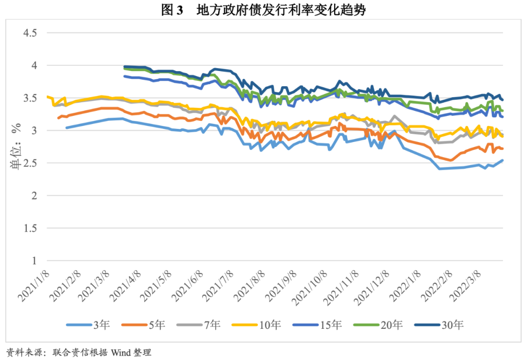 發行利率整體顯著下降。發行利率方面,2021年,央行繼續實施穩健的貨幣政策,綜合運用多種貨幣政策工具,通過公開市場操作、中期借貸便利(MLF)、定向中期借貸便利(TMLF)、常備借貸便利(SLF)以及央行票據互換等工具,合理安排工具搭配和操作節奏,維持市場流動性的合理充裕。2022年以來,國務院和國家發改委多次強調保持宏觀政策連續性、積極擴大有效投資、加強財政金融領域風險防控;部署用好政府債券擴大有效投資,促進補短板增后勁和經濟穩定增長。在寬松適度的貨幣政策和使用政府債券擴大有效投資背景下,2021年-2022年3月,地方政府債券發行利率整體呈下降走勢;2022年一季度,3~7年期地方政府債發行利率下降明顯,10年期及更長期限地方政府債發行利率亦有所走低,2022年3月,3年期地方政府債券平均發行利率2.47%,7年期政府債券平均發行利率2.95%,10年期平均發行利率2.97%。