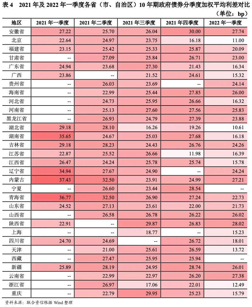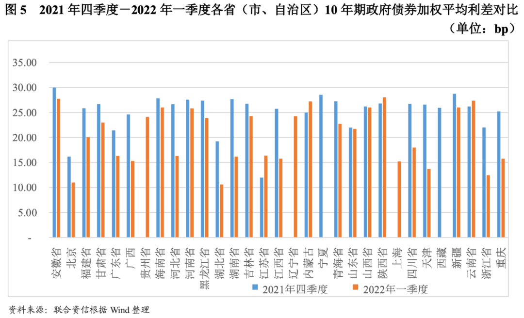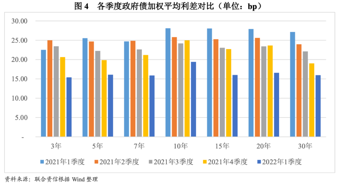 各期限發行利差和中長期品種的區域利差均有所收窄。發行利差方面,以同期限中債國債到期收益率為基準,2021年,7年期及以下地方政府債券平均利差除二季度小幅上升外,全年呈下降趨勢;10年期及以上期限地方政府債券平均利差在一季度和四季度小幅上升,全年呈波動下降趨勢;2022年一季度,各期限地方政府債券平均利差環比均大幅下降。分區域看,以發行規模最大的10年期地方政府債券為樣本,利差下降幅度最高的為天津市的12.87bp,降幅超過10bp的省份還包括河北省和湖南省;在利差整體下行的大背景下,內蒙古自治區、陜西省、云南省和江蘇省2022年一季度發行利差環比不降反升,其中江蘇省利差上行后仍處于較低水平,其余三省的利差水平則超過27bp。各省份間發行利差最大值與最小值差異由2021年四季度的18.20bp小幅下降至2022年一季度的17.42bp,省份間發行利差差異有所收窄。