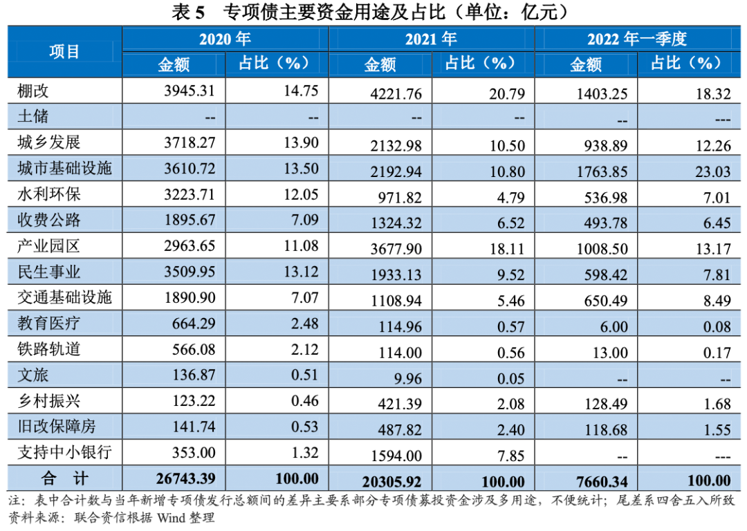 專項債募集資金主要投向結構變化不大。2022年一季度,專項債募集資金主要投向結構較2021年全年變化不大,仍以棚改、城市基礎設施和產業園區類項目等為主。其中,用于城市基礎設施建設的專項債券發行金額相當于2021年全年的80.43%。