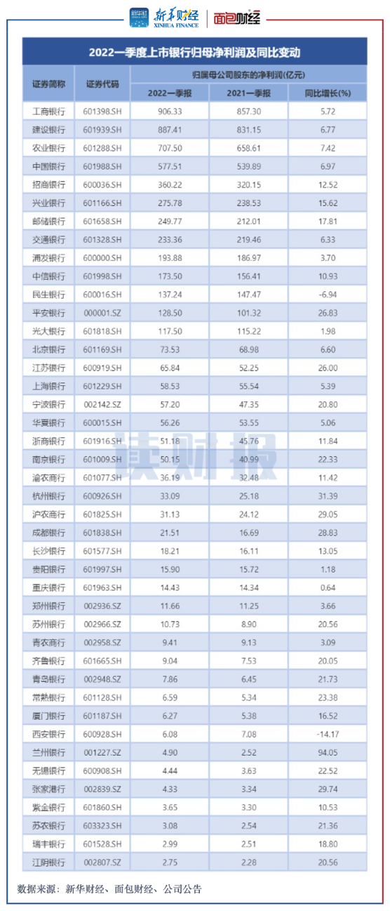 數據顯示,2022年一季度42家上市銀行合計實現歸母凈利潤5625.43億元,較上年同期增長8.71%。從凈利潤增速來看,普遍實現增長。