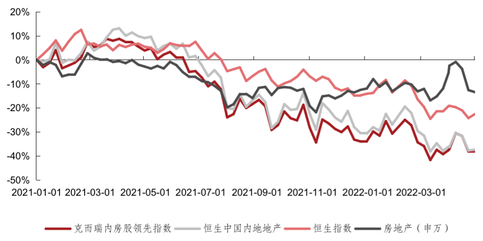 自2021年1月1日至4月底,克而瑞內房股領先指數跌幅38.1%,同期恒生中國內地地產指數跌幅37.4%,恒生指數跌幅22.6%,房地產(申萬)板塊跌幅13.4%。