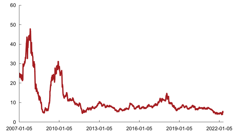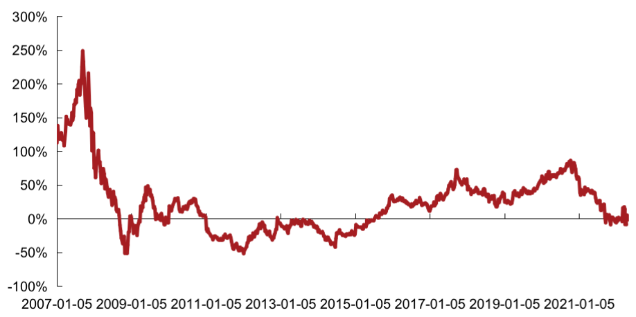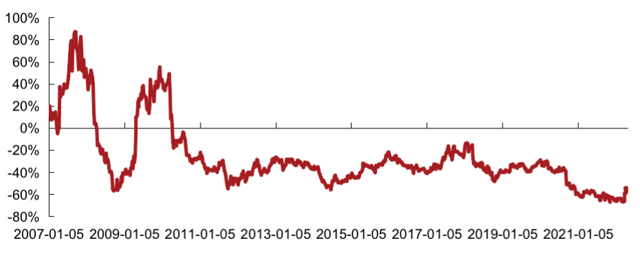 4月相對恒指PB周均值為2.4% ,低于上月的周均值7.2%,低于2021年全年相對恒指PB周均值22.5%。