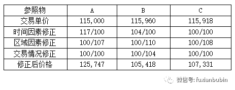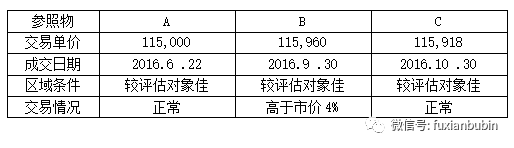 被評估對象與參照物結構相似、新舊程度相近,故無需對功能因素和成新率因素調整。被評估對象所在區域的綜合評分為100,三個參照物所在區域條件均比被評估對象區域好,綜合評分分別為107、110和108。當時房產價格月上漲率為4%,故參照物A的時間因素調整系數為:117/100;參照物B的時間因素調整系數:104/100;參照物C因在評估基準日當月交易,故無需調整。三個參照物成交價格的調整過程如下: