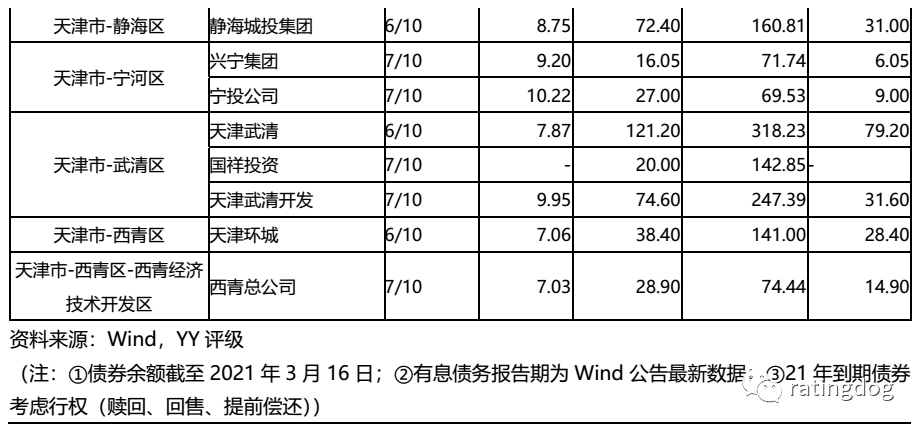 從21年到期/行權(quán)債券占存續(xù)債余額比例來看,有19個(gè)平臺21年到期債券占比超50%,其中7個(gè)平臺存續(xù)債券均在21年到期/行權(quán),整體來看天津區(qū)域城投平臺21年債券到期壓力較大。