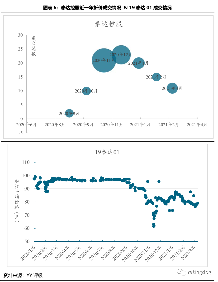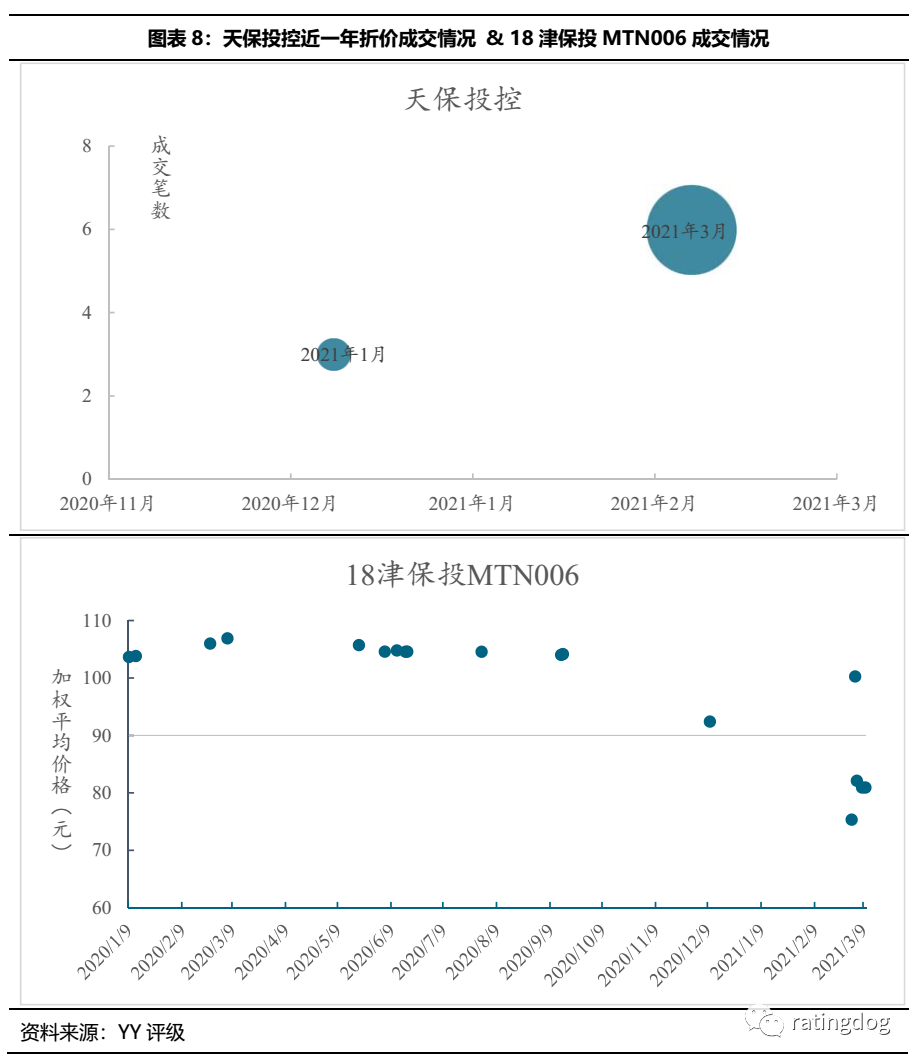從成交情況來看,津城建折價(jià)成交始于20年12月,至21年3月,折價(jià)成交開始增多,或受區(qū)域負(fù)面輿情影響所致。20津投10成交價(jià)20年4月以來維持在90以上,20年12月出現(xiàn)零星折價(jià)成交,21年2月底價(jià)格走低重現(xiàn)折價(jià)成交。