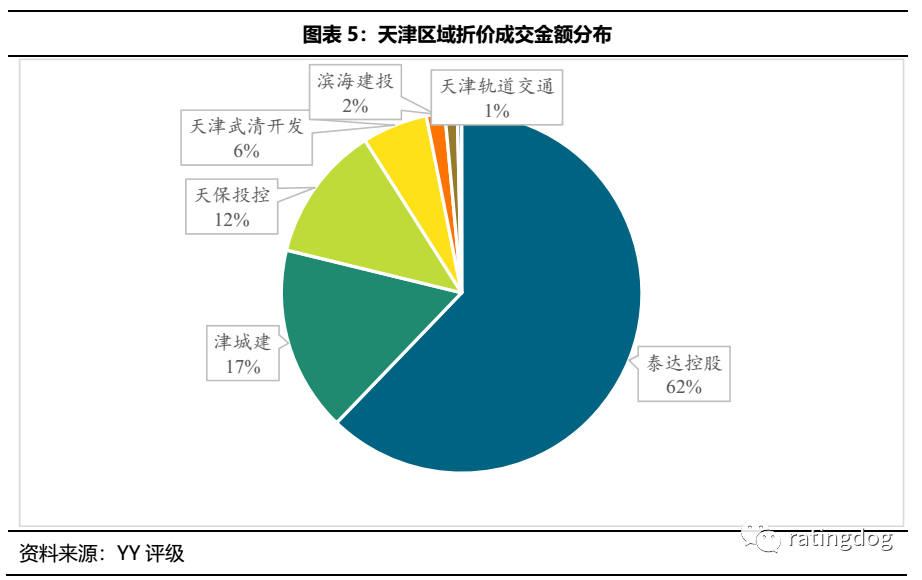 天津區(qū)域折價(jià)成交主要集中泰達(dá)控股、津城建、天保投控、天津武清開發(fā)、濱海建投、天津軌道交通、天津武清、市政投資等平臺,其中泰達(dá)控股成交金額占比最高,達(dá)62%。