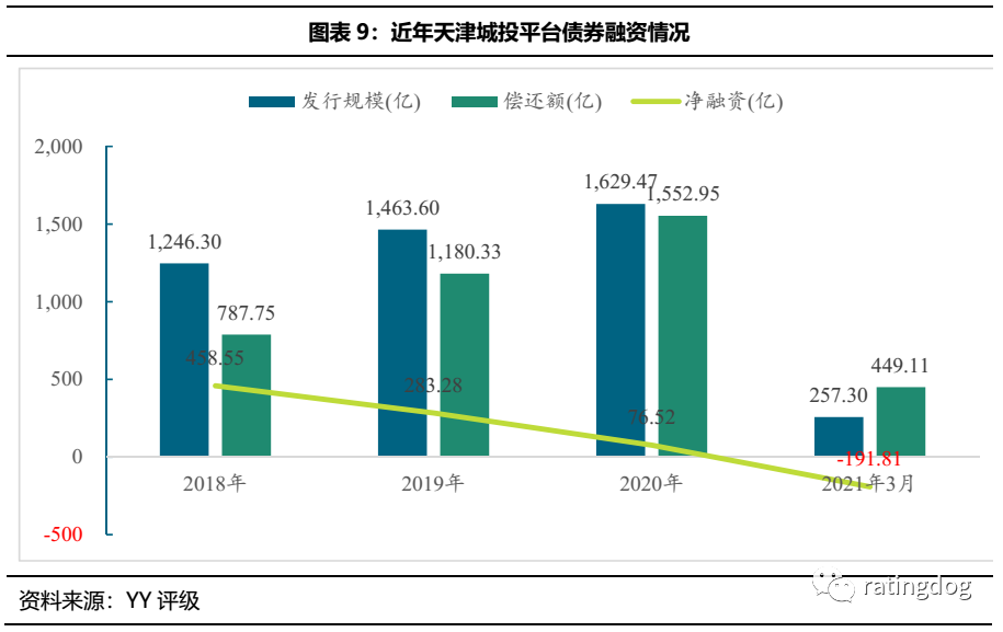 總體來看,天津區(qū)域經(jīng)濟(jì)縮水,金融資源乏力,債券凈融資逐年下滑,整體融資壓力大。