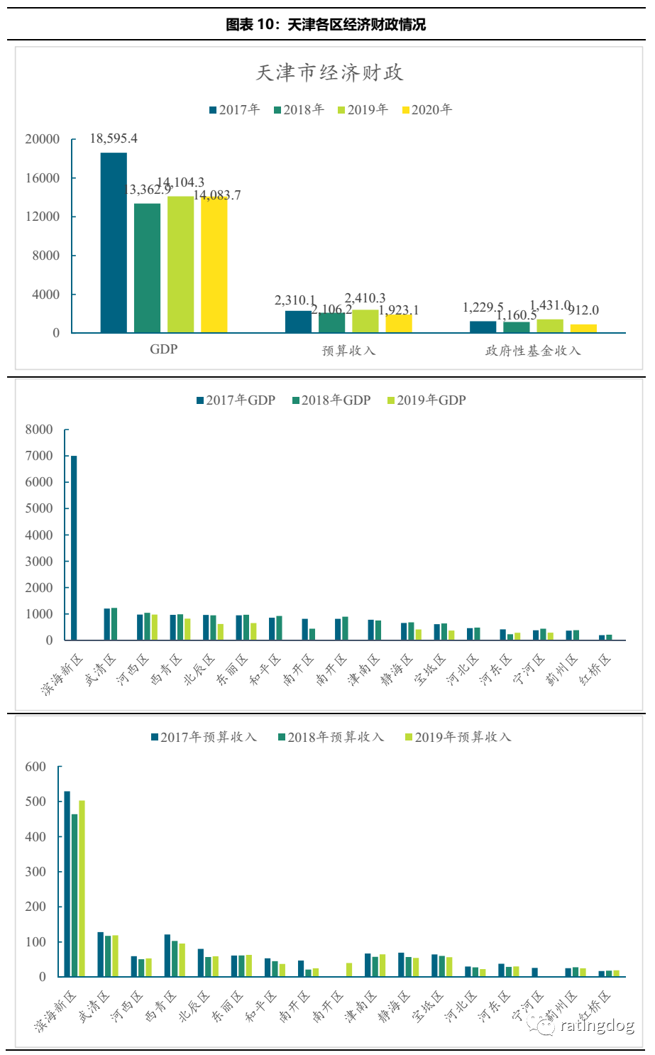從經(jīng)濟(jì)財(cái)政來看,天津GDP自2018年第四次經(jīng)濟(jì)普查以來出現(xiàn)較大縮水,至2020年仍未恢復(fù)。20年受疫情影響,天津市GDP、預(yù)算收入和基金收入均保持負(fù)增長,預(yù)算收入和基金收入下降幅度較大。