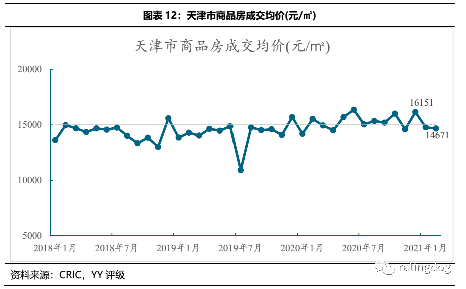 根據(jù)CRIC的統(tǒng)計(jì)數(shù)據(jù),天津市商品房成交均價(jià)整體較為平穩(wěn),20年以來突破15,000元/m2,小幅震蕩波動(dòng),21年2月房價(jià)14,671元/ m2。