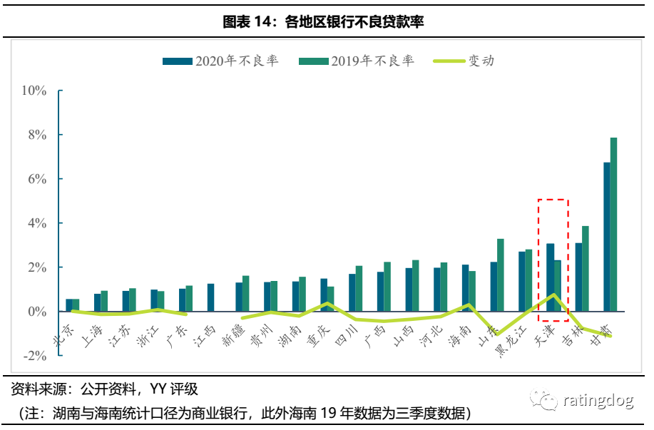 從20省份(市/自治區(qū))的銀行不良貸款率來看,只有天津、重慶、浙江、海南四地20年不良率上升。此外天津銀行不良貸款率排名第三,截至2020年四季度末,天津銀行業(yè)金融機(jī)構(gòu)不良貸款率為3.04%,而2019年末為2.29%,上升了0.75%。